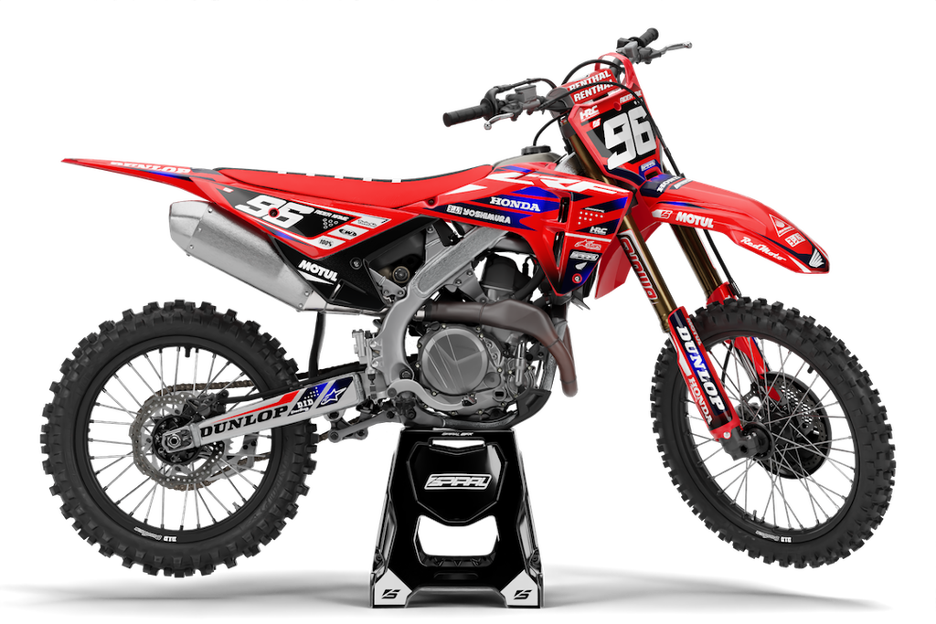 Kit graphique de motocross Honda // Onyx Red fabriqué par SpiralGFX, sous licence KTM, Husqvarna et Gas Gas et imprimé sur les meilleurs matériaux avec un équipement d'impression de haute qualité.