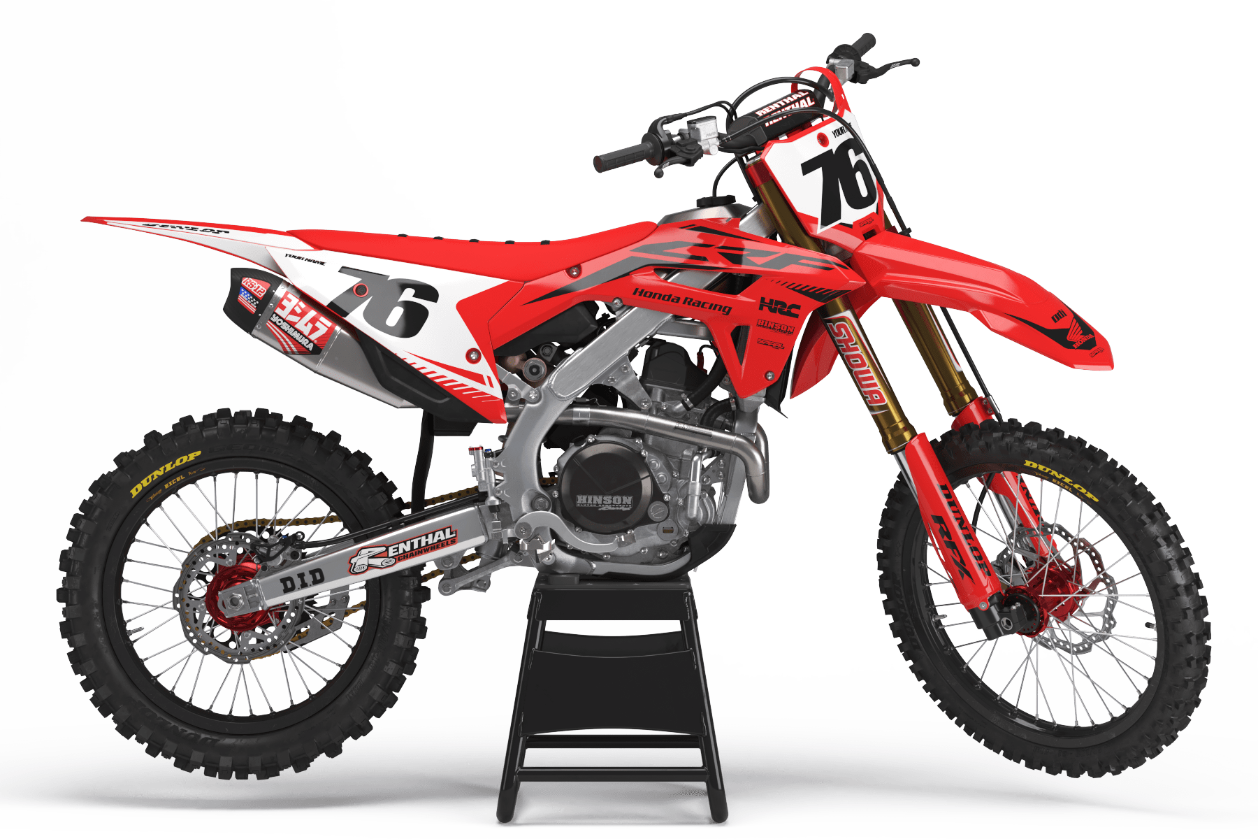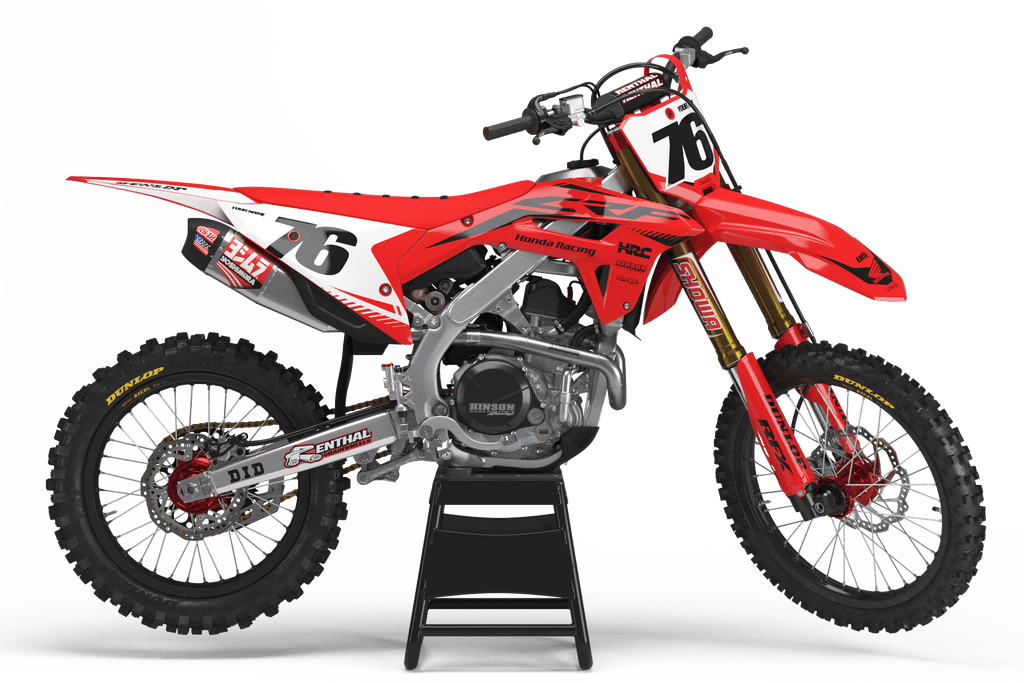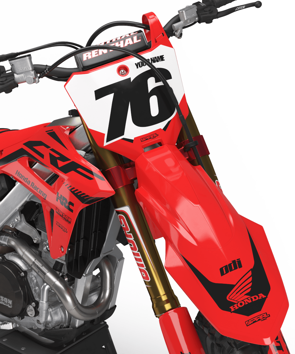 Kit graphique de motocross Honda // Stock Black fabriqué par SpiralGFX, sous licence KTM, Husqvarna et Gas Gas et imprimé sur les meilleurs matériaux avec un équipement d'impression de haute qualité.