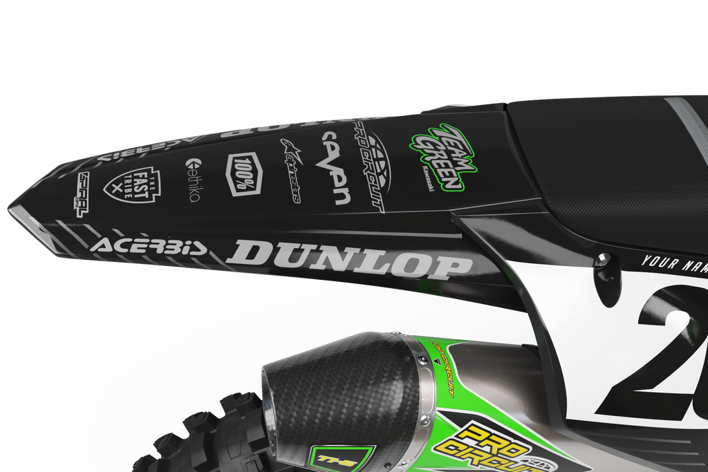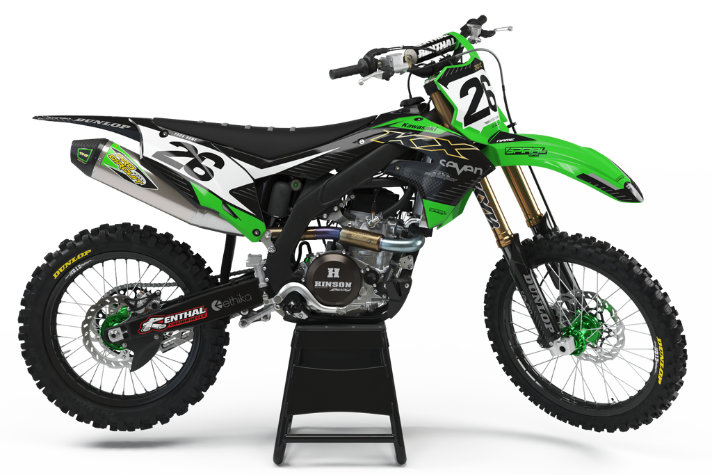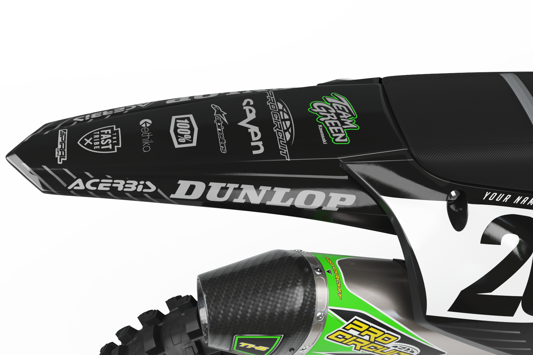 Kit graphique de motocross Kawasaki // Qualify Green fabriqué par SpiralGFX, sous licence KTM, Husqvarna et Gas Gas et imprimé sur les meilleurs matériaux avec un équipement d'impression de haute qualité.