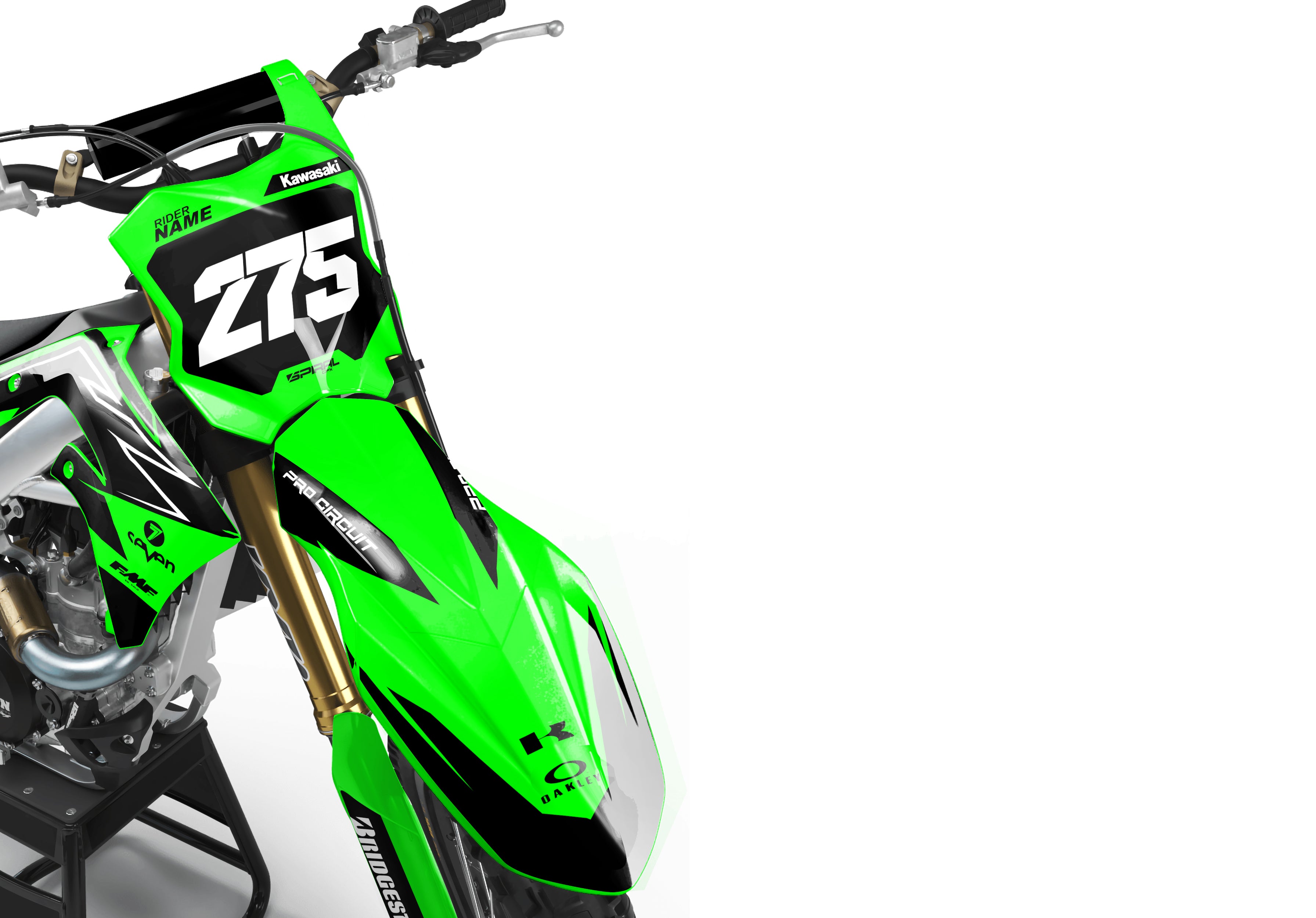 Kawasaki // Strike Green Motocross Graphics Kit made by SpiralGFX, Licensed by KTM, Husqvarna & Gas Gas and printed on the very best materials with high quality print equipment.