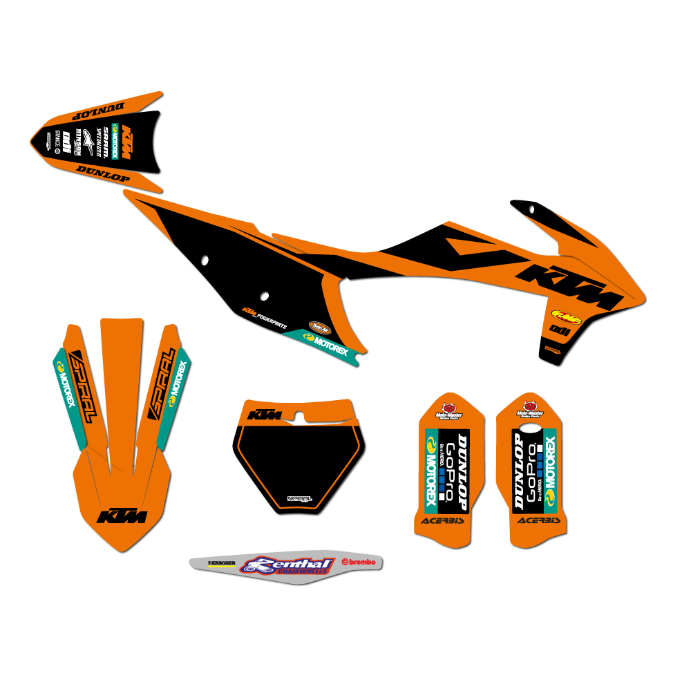 Full MX Graphics Kit - Kit Includes: Radiator Shrouds, Front and Side boards, Air Box Decals (if applicable) Front Fender Decal, Rear Fender Decal, Fork Guard Decals & Swing Arm Decals