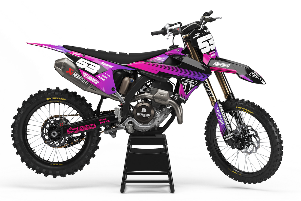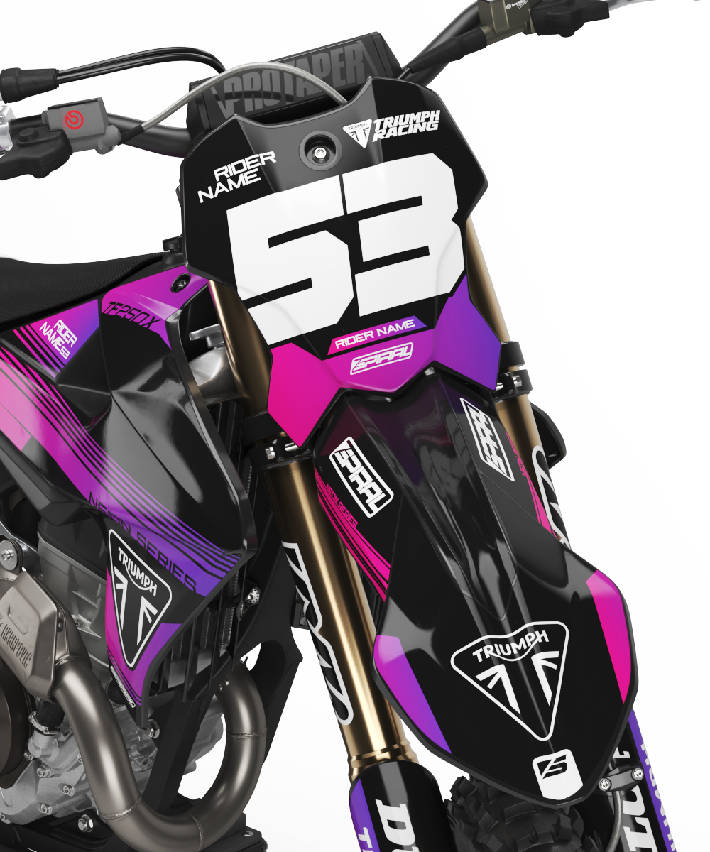 Triumph // Neon Pink Purple Motocross Graphics Kit made by SpiralGFX, Licensed by KTM, Husqvarna & Gas Gas and printed on the very best materials with high quality print equipment.